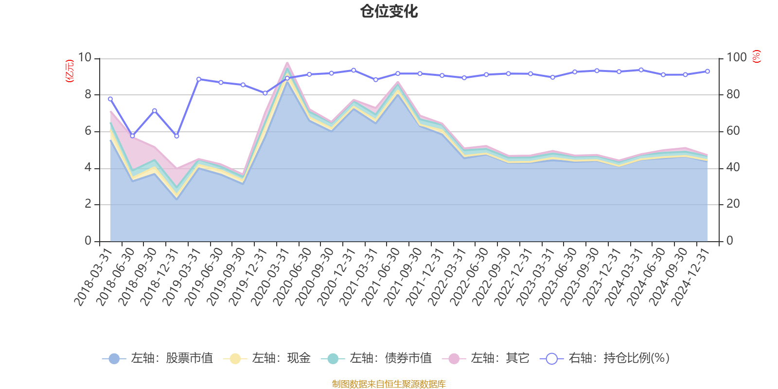 据定期报告数据统计,近三年平均股票仓位为91.74%,同类平均为79.88%。2024年一季度末基金达到93.69%的最高仓位,2018年末最低,为57.55%。